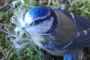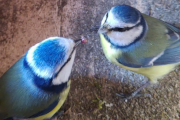 Mrs. B. comes and has a look at the mess on the floor, before hopping up to the door and giving it a damn good pecking. This is quite common with blue tits, and no-one really knows why they do it.