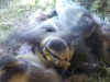 The chicks having a bit of a feed and a kip. You can see dark lines on their backs and wings - this is where the feathers will start coming out.